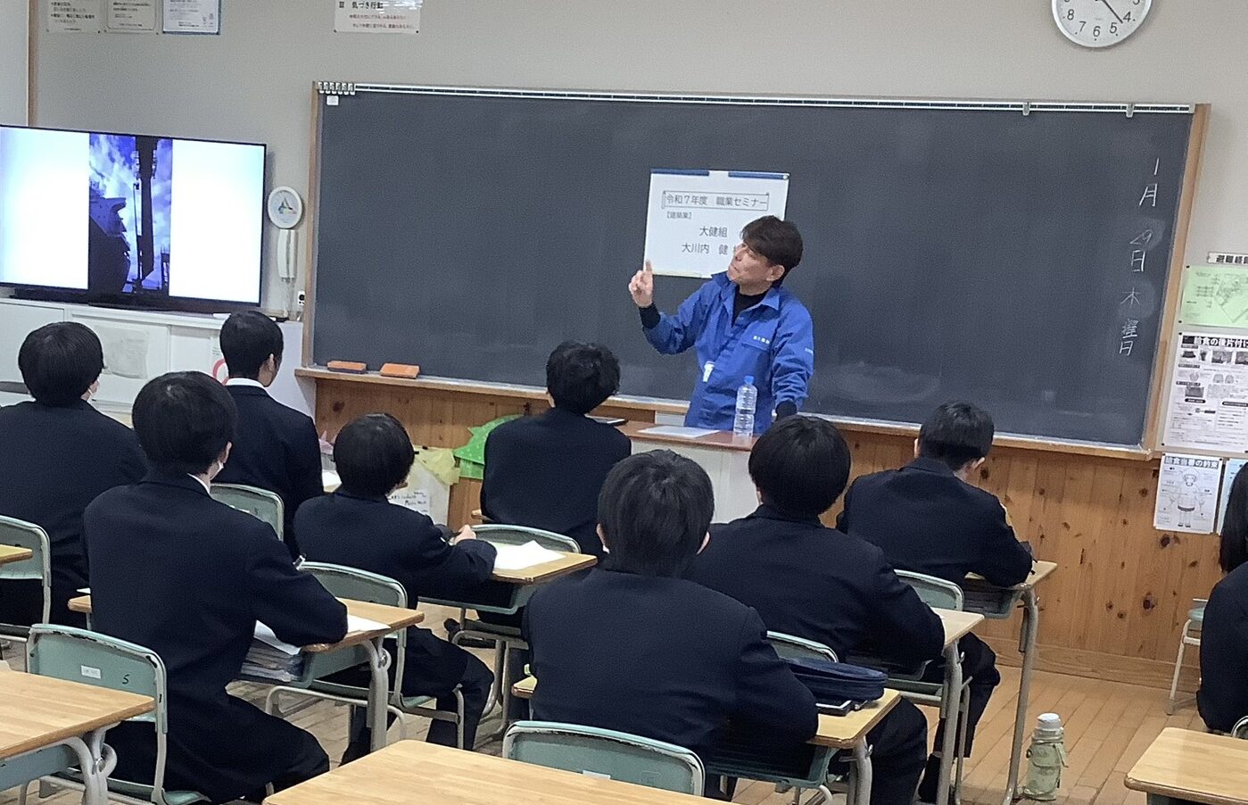 セミナーは「重量鳶という仕事を知っていますか?」という問いかけからスタート。予想通り、手を挙げた生徒はほとんどいませんでした。しかし、「皆さんが毎日通っているこの学校の鉄骨も、病院や工場の大型機械も、私たち重量鳶が設置しているんです」と説明すると、生徒たちの表情が変わりました。